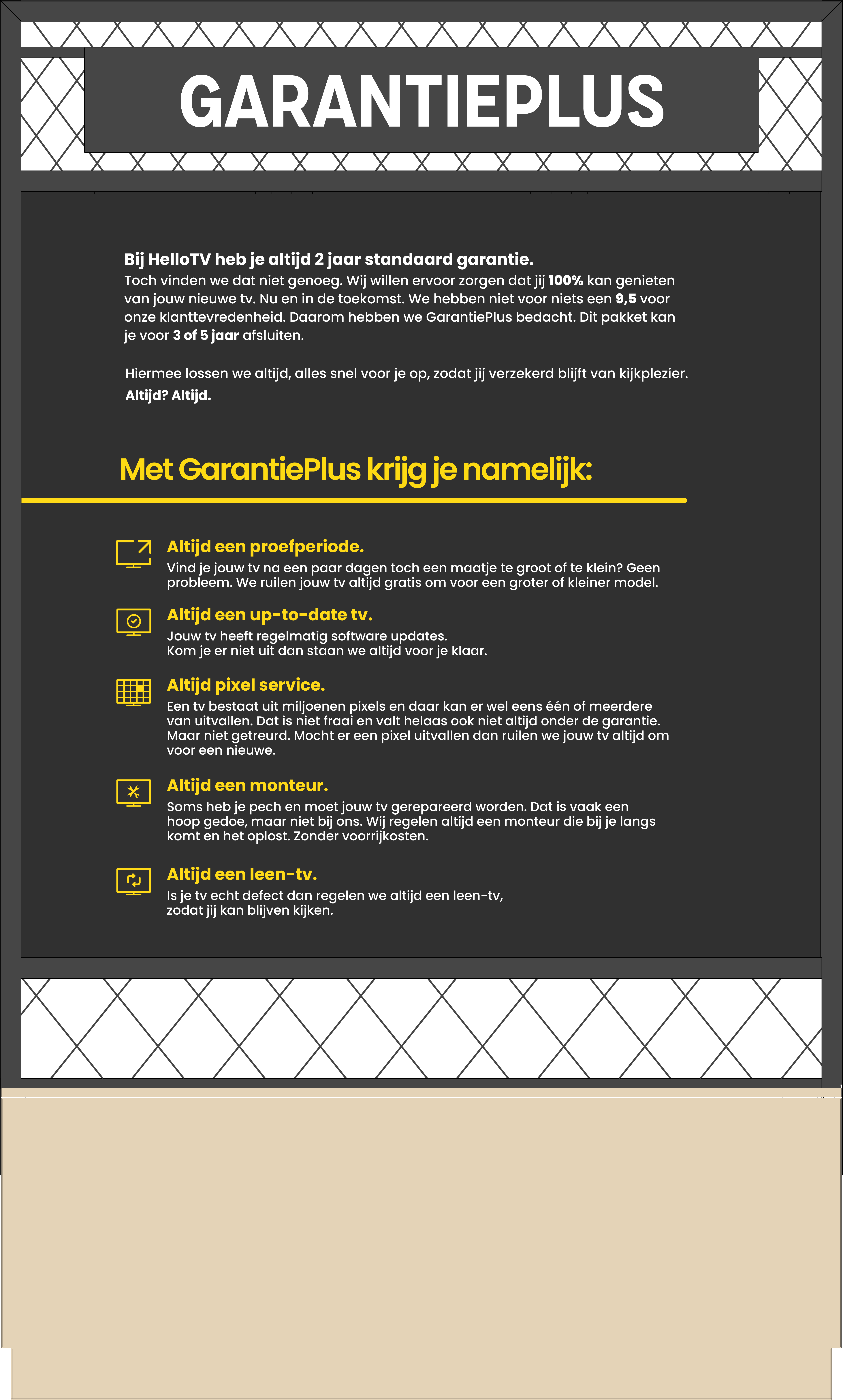 Creating an engaging in-store experience requires both strategic design and practical execution. Working alongside Teamwork Interiors, I played a role in the measurements, TV and product placement, as well as designing the text and visual elements for the modular HelloTV service wall.