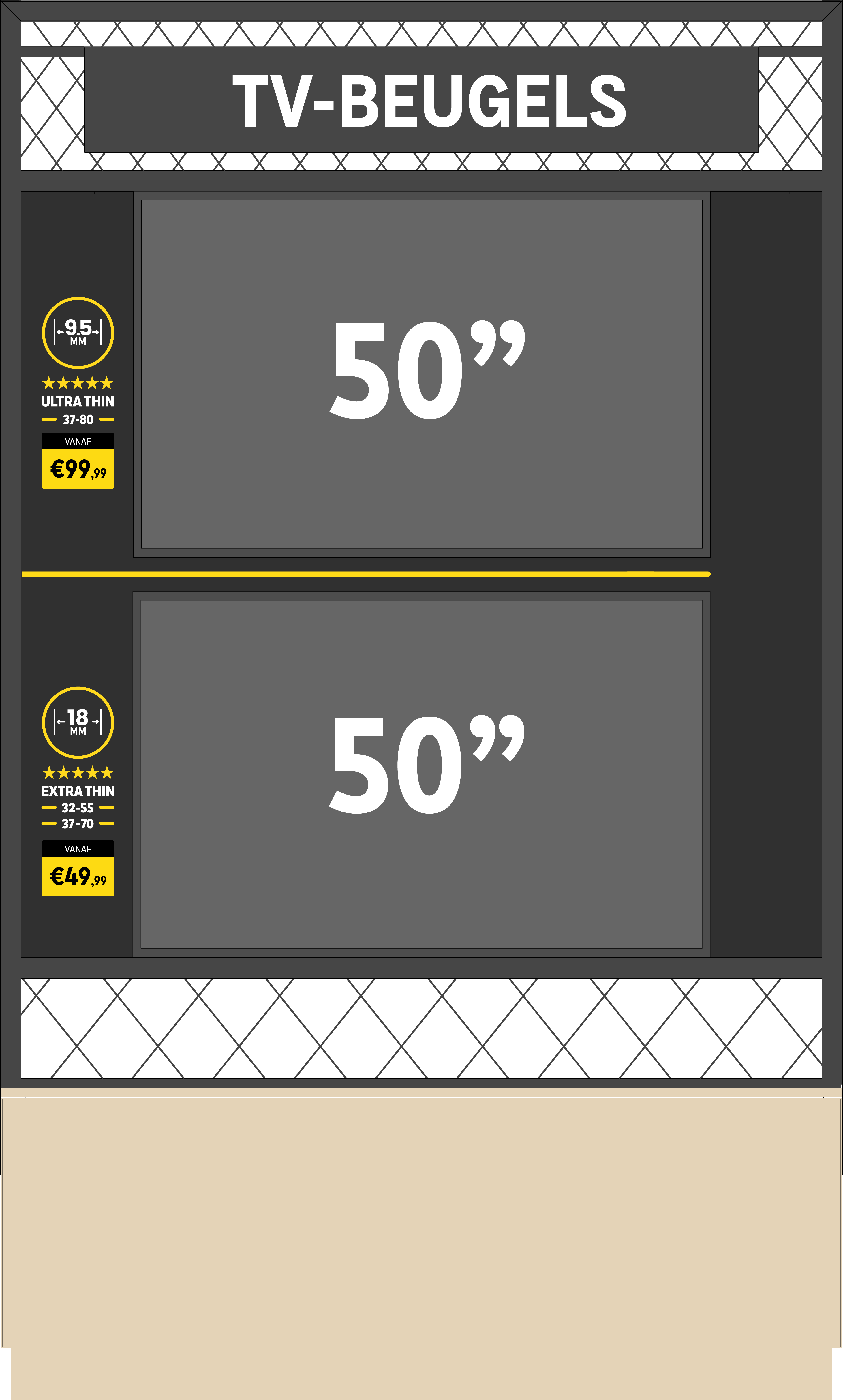 This multi-purpose display was designed to educate and inspire customers, showcasing the benefits of a calibrated vs. non-calibrated TV, demonstrating how HelloTV’s ultra-slim wall mounts enhance a room’s aesthetics, and even serving as a retail space to promote HelloTV’s warranty plans. The result? A visually striking, functional, and informative store display that elevates the shopping experience.